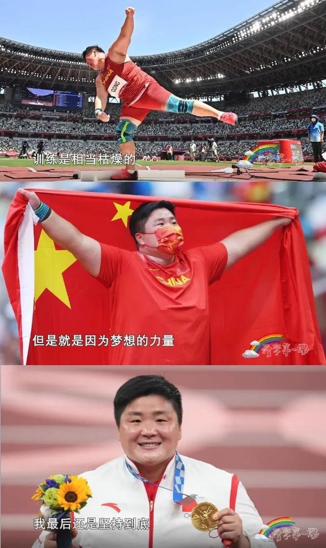 在《开学第一课》节目现场,巩立姣坦言,铅球项目的训练其实是相当枯燥的,而自己一练就是二十一年,是夺冠的理想、为祖国争光的信念,支撑着她在失败和伤病中坚持下来。作为一名党员,巩立姣把这枚金牌当作献给党和祖国的礼物,也用自己的行动向全世界展现了中国力量。在《开学第一课》视频连线的最后,已经32岁的巩立姣,仍然目光坚定地说道:“只要祖国需要我,我就会一直练下去的。”