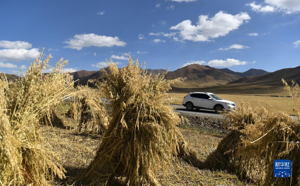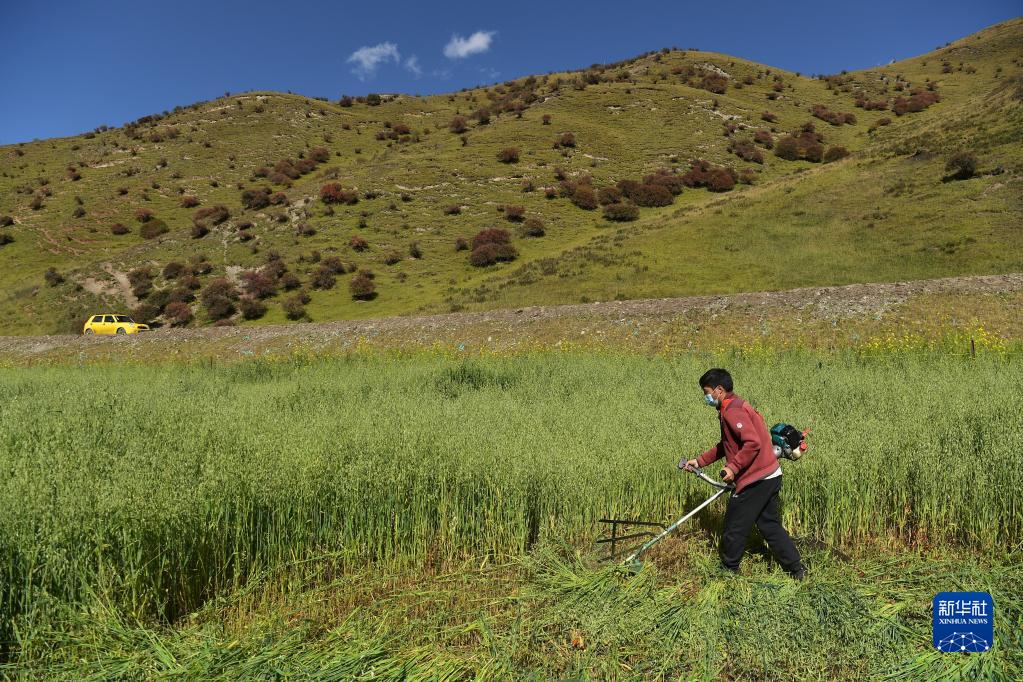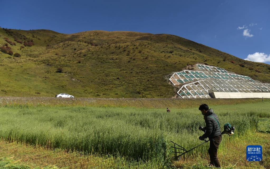 9月28日,同仁市瓜什则乡赛庆村牧民诺日加在建成通车的大瓜公路旁收割牧草。新华社记者 张宏祥 摄