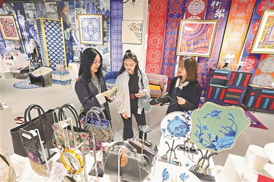 4月24日,北京市丰台区的一家服饰公司内,工作人员正在向顾客介绍采用传统纹样设计的服饰及文创产品。