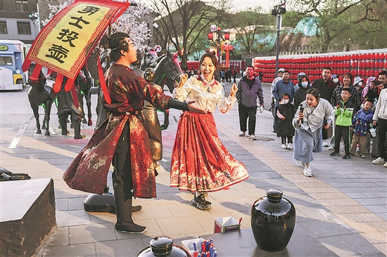 4月24日,北京市延庆区,游客在景区内与演员互动,体验投壶游戏。