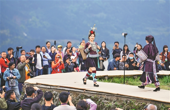 4月26日,村民在贵州省从江县加榜梯田上参加梯田走秀活动。