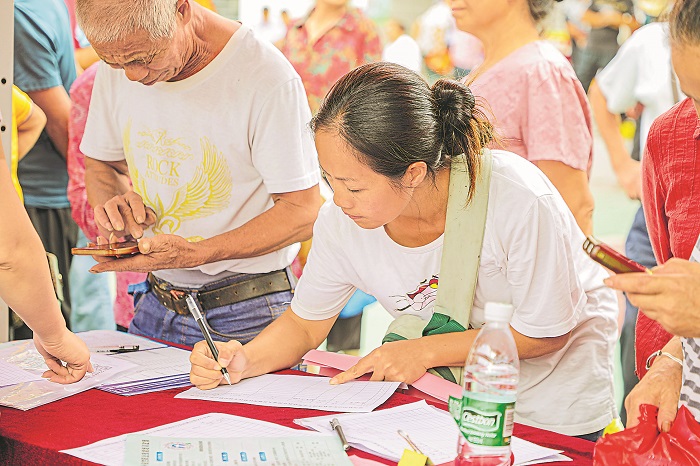 10月11日,广西壮族自治区桂林市灵川县公平乡,求职者在招聘会现场填写个人信息。