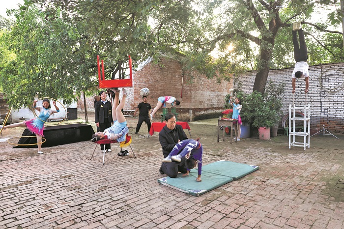 10月16日,吴桥县铁城镇张松村的杂技小院,杂技教练何书胜带着弟子们排演节目。