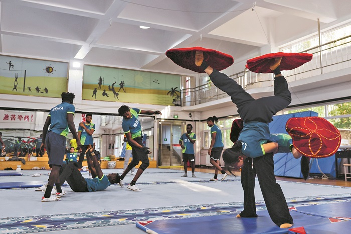 10月13日,来自非洲的学员们在一起练习“大武术”杂技。