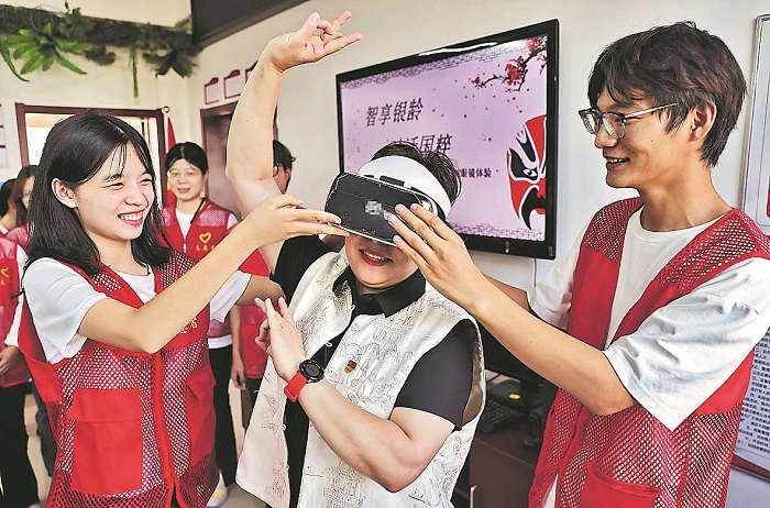 日前,河北科技师范学院数学与信息科技学院联合秦皇岛市海港区铁路里社区,开展“智享银龄 对话国粹”银龄课堂活动。活动中,大学生党员志愿者走进社区,将VR技术与京剧文化相融合,现场讲解VR设备的使用方法,带领居民们借助VR设备“零距离”感受京剧魅力。通过VR设备,大家不仅能清晰欣赏戏服纹样的精细,还能沉浸式体验演出氛围,为传统文化的传承与普及注入新的科技活力。