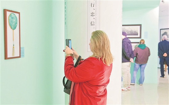 图为近日人们在塞尔维亚贝尔格莱德的中国文化中心参观“山海志合——庆祝中塞人民友谊70年书画展”。