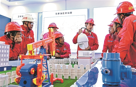 为推进油气集输站场信息化升级,中国石化中原油田地面工程抢维修中心文卫第二采油服务项目部班组职工反复测试校准参数,有效解决设备适配难题。图为10月14日项目部班组职工在创新工作室拆解室外监控球机设备寻找症结。
