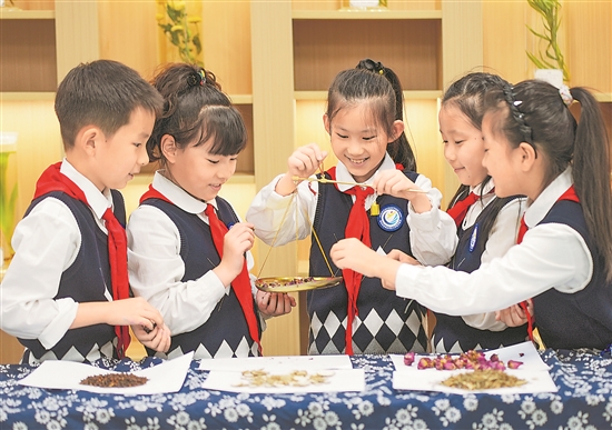 10月22日,在江苏省泰州市姜堰区实验小学教育集团北街北校区,学生体验称量中草药。10月22日是世界传统医药日,各地组织开展中医药文化体验主题活动,让大家了解中医药知识,感受中医药文化魅力。新华社发(周社根 摄)