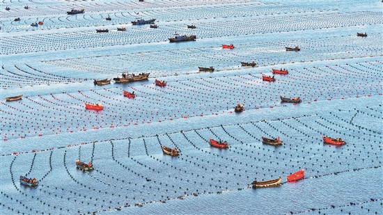10月22日,在山东省荣成市爱伦湾海洋牧场海带育苗区,养殖工人忙碌着进行海带育苗养殖作业。海带育苗期从每年8月份开始,到11月中旬结束,为届时海带“插秧”做好前期准备。海带苗从育苗车间到投放海区正式“插秧”前,需要在海上育苗区进行过渡,以便更好地适应海水生存环境,提高海带成活率和生长品质。