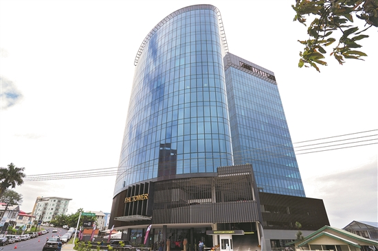 图为近日在斐济首都苏瓦拍摄的由中国中铁一局集团有限公司承建的斐济首座绿色建筑——FHL大厦。