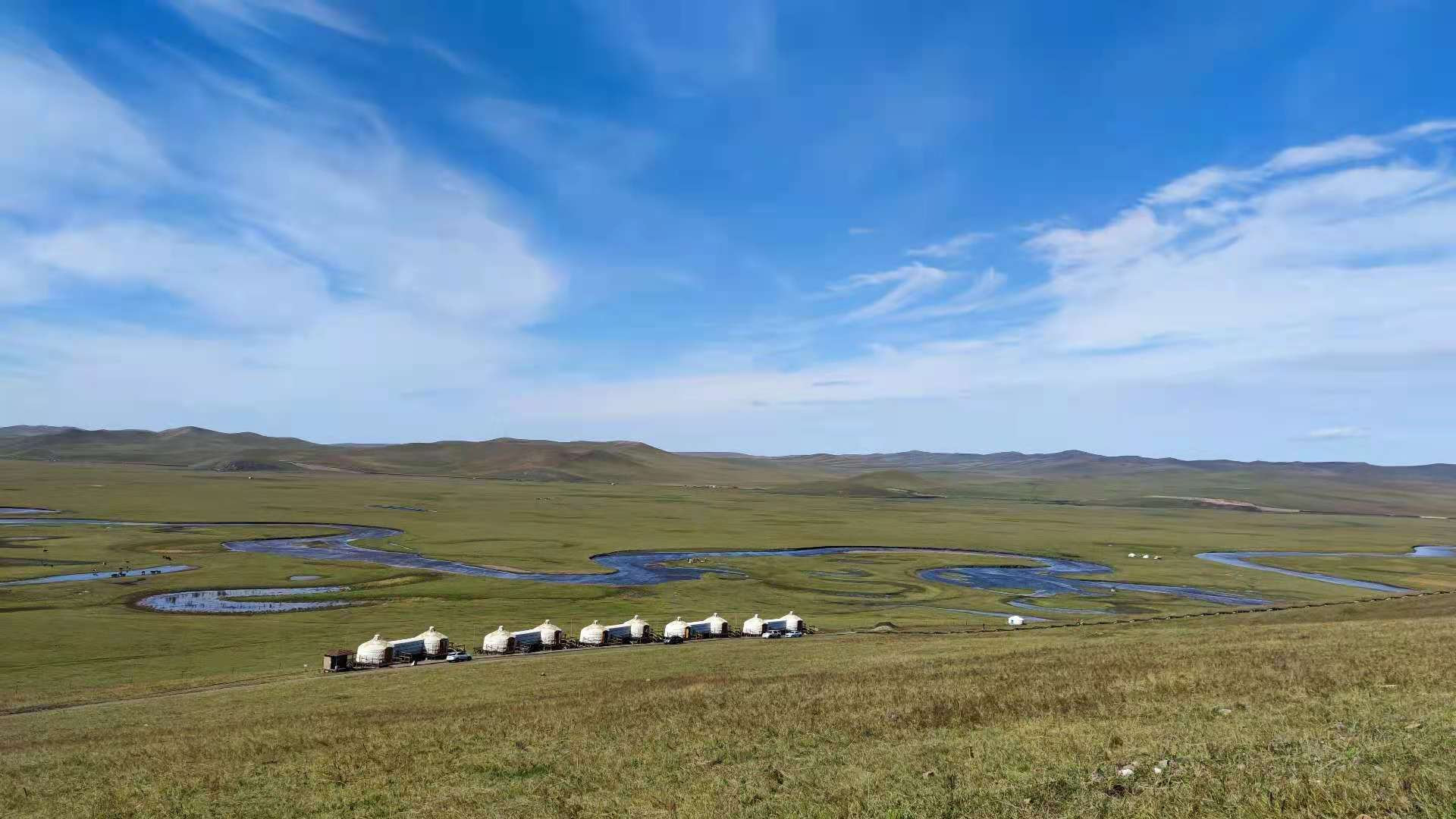 2018年7月,夏营地片区的牧云山顶景区开门迎客,因其独特绝佳的自然景观受到游人的热捧。站在牧云山顶俯瞰,莫日格勒河宛如一条泛着银光的丝带,点缀在绿宝石般的草原。河两岸草浪滚滚、鲜花盛开、马嘶羊咩。
