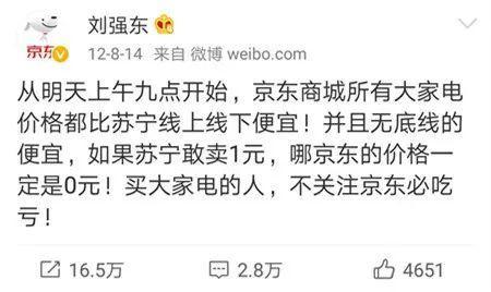 2012年8月14日,刘强东发微博称所有大家电都比苏宁便宜。来源:刘强东微博截图