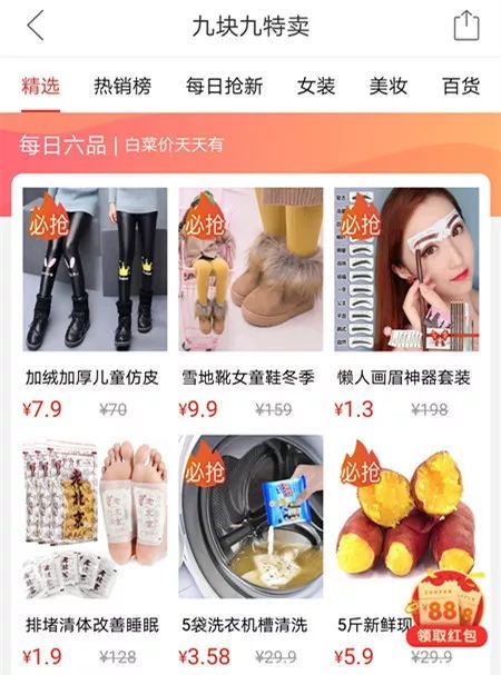 拼多多把娱乐社交的元素融入电商运营中,对价格的把握直击社会最底层的普罗大众,“九块九包邮”成为最令消费者心动的诱惑。