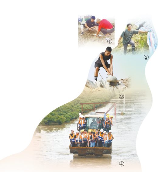二话不说,蔡大伟直奔险情发生路段。一边进行打桩处理,一边组织搬运物资。沙石来了一车又一车,防汛队员们一铲接一铲,时不时手脚并用,将沙石装进沙袋。搬运组则负责扛着沙袋,将其堆满30米长的险情要段。经过近6个小时的奋战,大家终于控制住了险情。顾不上休息,蔡大伟擦了擦额头上的汗,又赶往了下一个“风险点”。