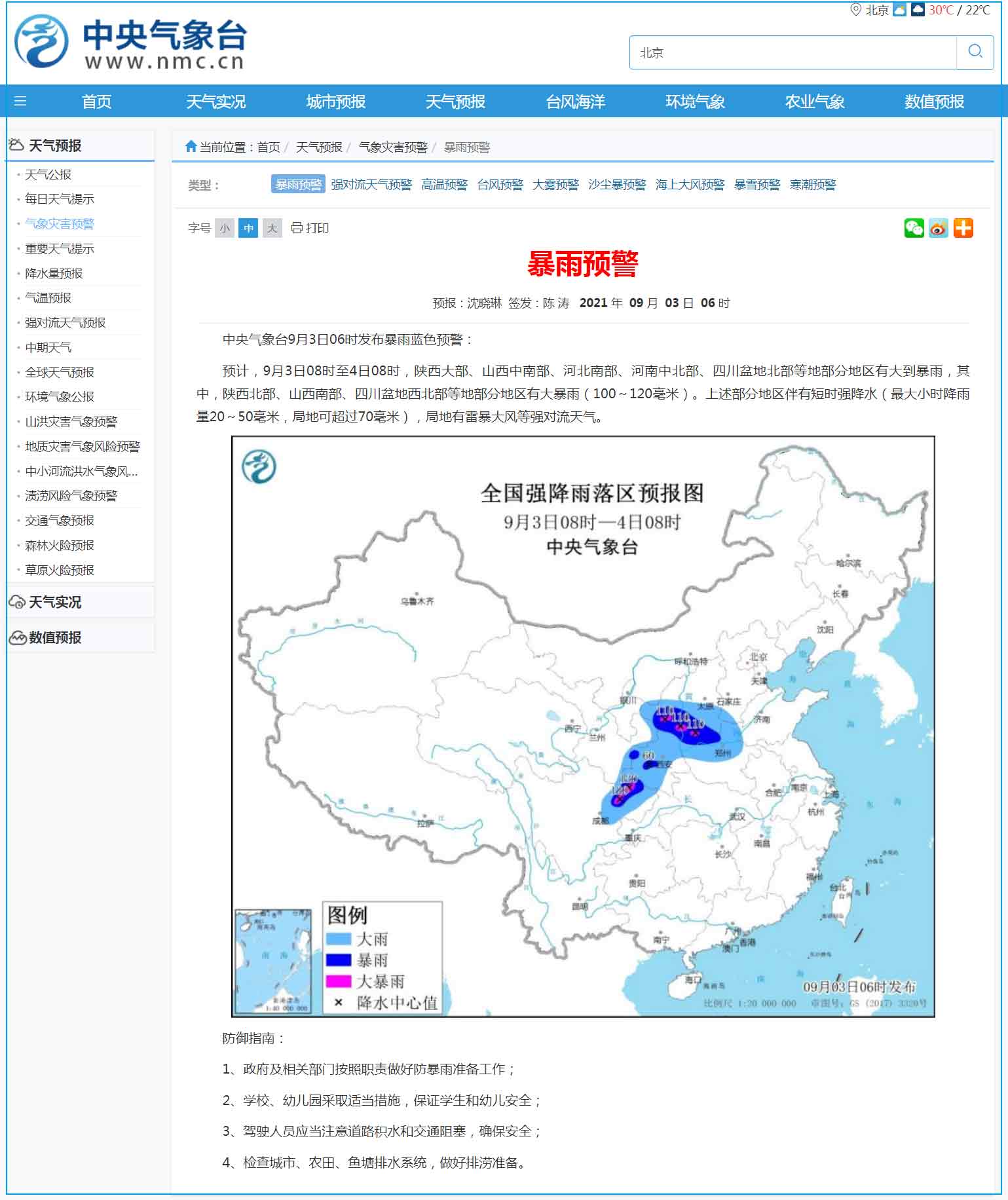 中工网讯 中央气象台9月3日06时发布暴雨蓝色预警:预计,9月3日08时至4日08时,陕西大部、山西中南部、河北南部、河南中北部、四川盆地北部等地部分地区有大到暴雨,其中,陕西北部、山西南部、四川盆地西北部等地部分地区有大暴雨(100~120毫米)。上述部分地区伴有短时强降水(最大小时降雨量20~50毫米,局地可超过70毫米),局地有雷暴大风等强对流天气。