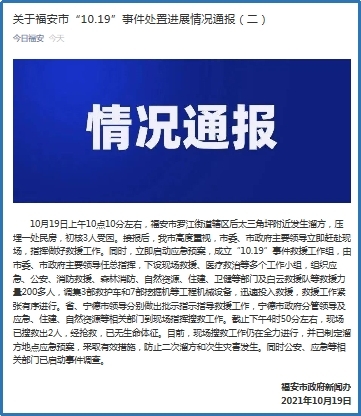 福建省、宁德市领导分别做出批示指示指导救援工作,宁德市政府分管领导及应急、住建、自然资源等相关部门到现场指挥搜救工作。截至下午4时50分左右,现场已搜救出2人,经抢救,已无生命体征。目前,现场搜救工作仍在全力进行,并已制定溜方地点应急预案,采取有效措施,防止二次溜方和次生灾害发生。同时公安、应急等相关部门已启动事件调查。