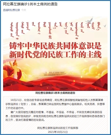 请广大居民理性沉着应对疫情,不造谣、不信谣、不传谣,不转发无确切来源的信息,自觉做好自我防护,积极支持配合阿拉善左旗新冠肺炎防控工作指挥部和各级各部门的工作,坚决打赢疫情防控攻坚战。