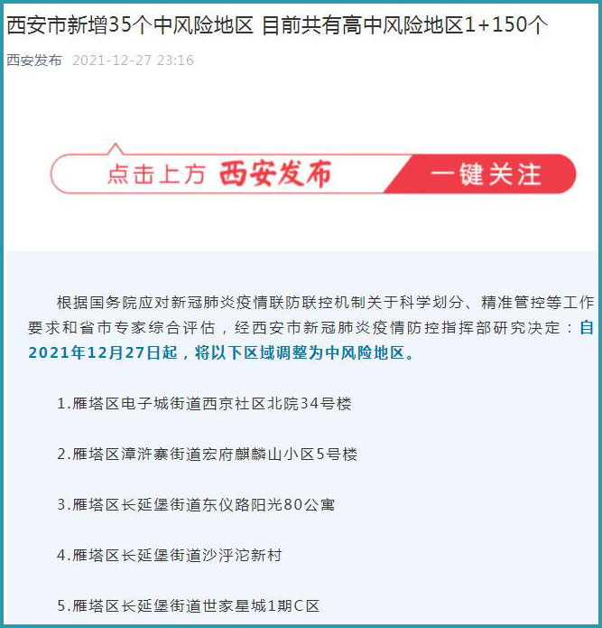 截至12月27日,西安市共有高风险地区1个,中风险地区150个