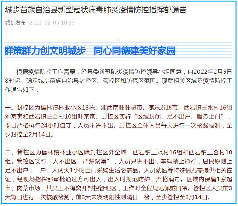 中工网讯 据“城步发布”微信公众号消息,2月5日,湖南邵阳市城步苗族自治县新冠肺炎疫情防控指挥部发布通告。通告称,根据疫情防控工作需要,经县委新冠肺炎疫情防控领导小组同意,自2022年2月5日8时起,确定城步苗族自治县封控区、管控区和防范区范围。相关区域及疫情防控工作通告如下: