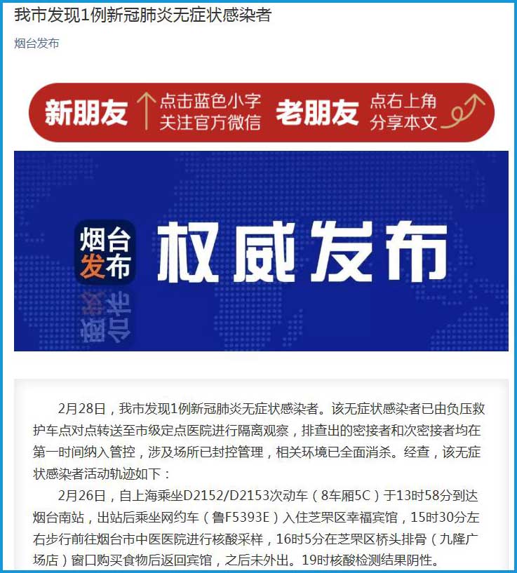 中工网讯 据烟台发布微信公众号消息,2月28日,烟台市发现1例新冠肺炎无症状感染者。该无症状感染者已由负压救护车点对点转送至市级定点医院进行隔离观察,排查出的密接者和次密接者均在第一时间纳入管控,涉及场所已封控管理,相关环境已全面消杀。经查,该无症状感染者活动轨迹如下:
