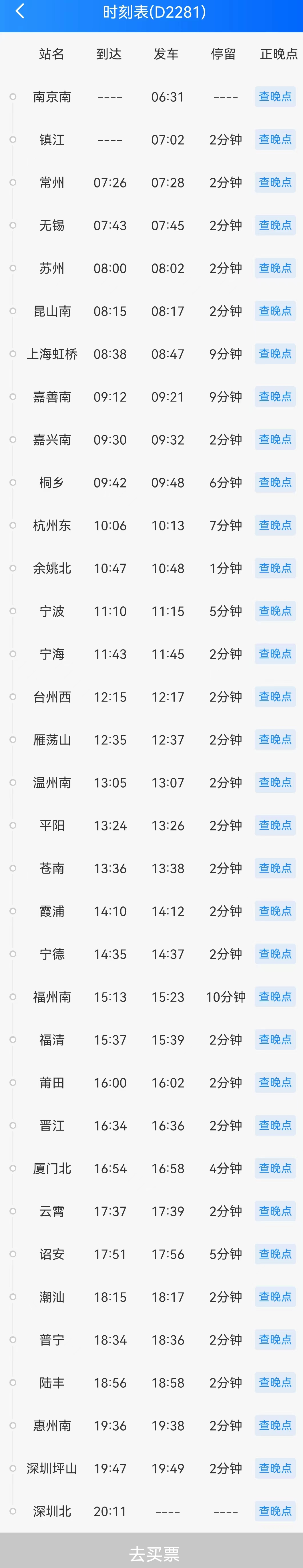 D2281次列车始终站点为南京-深圳北,全程共14小时08分,沿途经过江苏、上海、浙江、福建、广东等多省市。