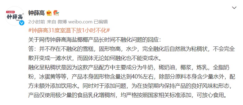 钟薛高回应雪糕不化:固形物高,符合国家相关标准