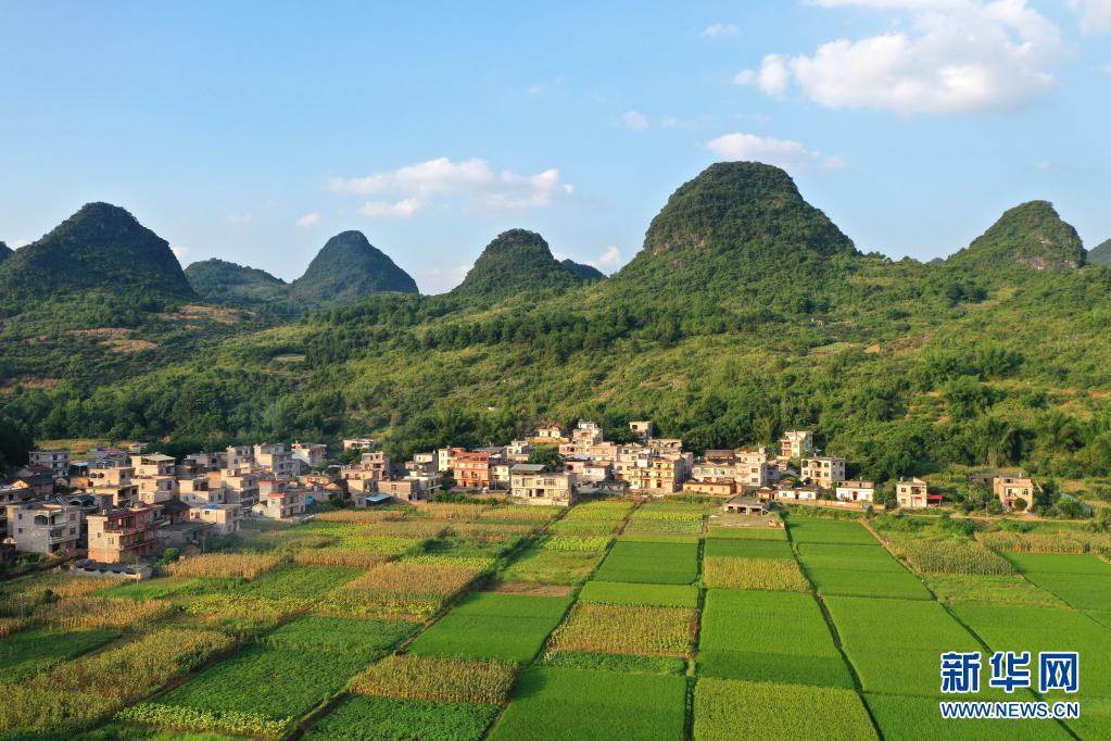盛夏时节,广西平乐县张家镇田园郁郁葱葱,美不胜收(7月14日摄,无人机照片)。