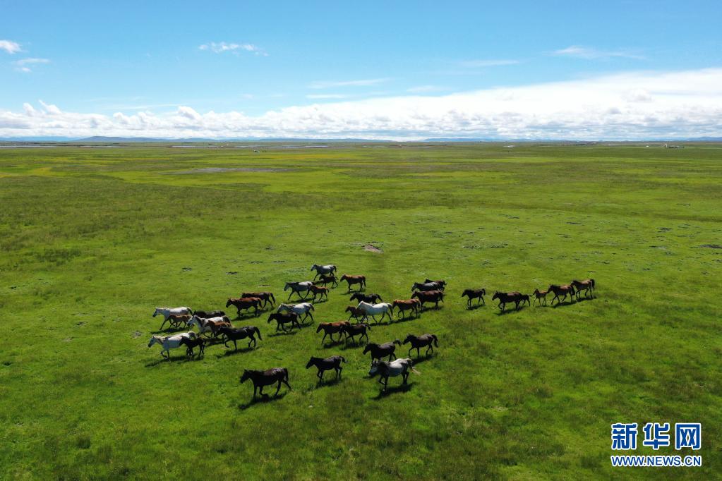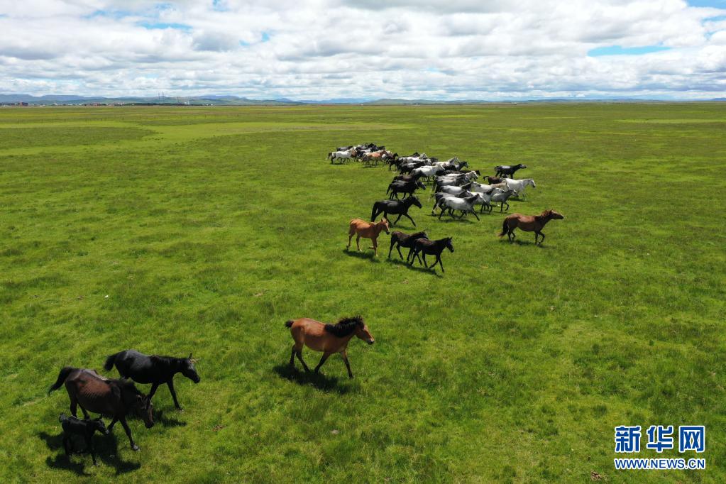 这是7月15日在甘肃玛曲县河曲马场拍摄的河曲马(无人机照片)。