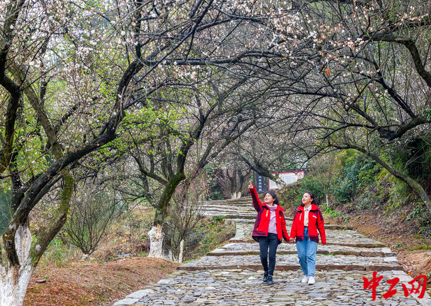 江西赣州市大余县梅关古驿道两旁的梅花树迎春绽放,吸引游客前来赏花。(刘志勇摄)