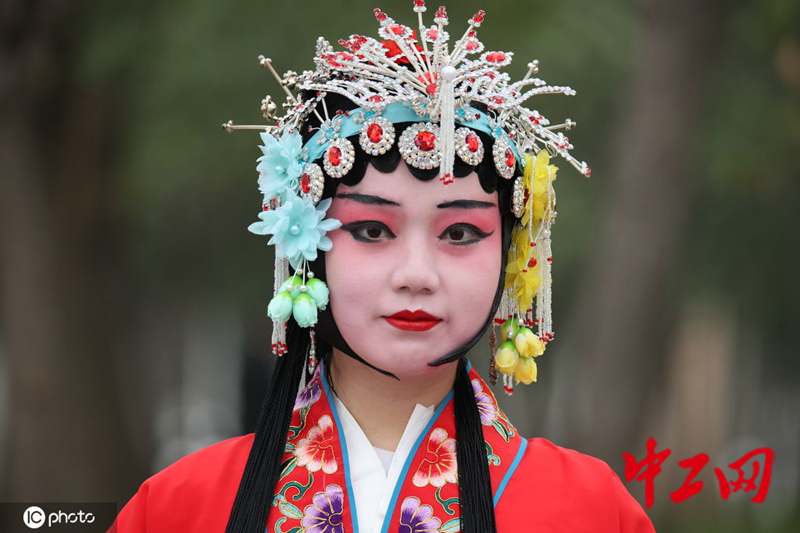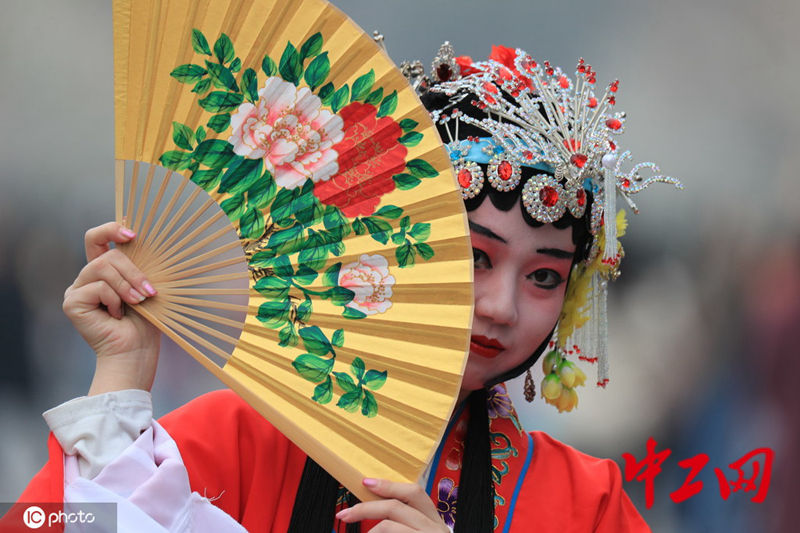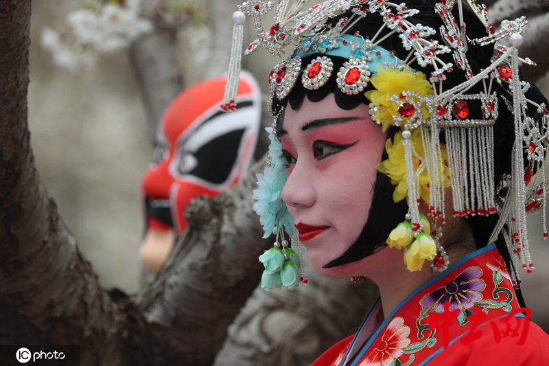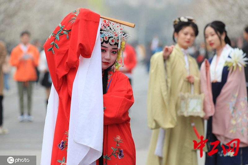 2021年3月12日,河南许昌,一位身着戏服的许昌学院大学生在第四届“樱花文化节”活动现场。