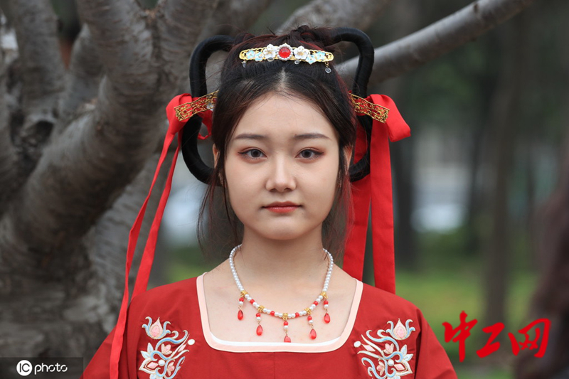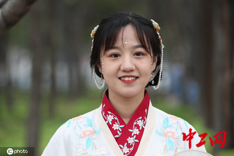 2021年3月12日,河南许昌,身着汉服的许昌学院大学生在第四届“樱花文化节”活动现场。