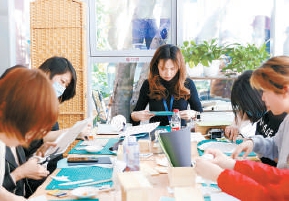 市民在郎园书市体验手工制作书籍。