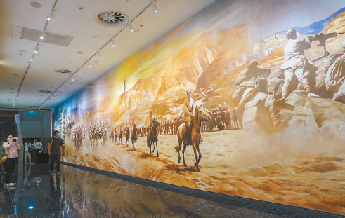 巍峨蜿蜒的长城、气吞万里的黄河、雄浑壮丽的太行山脉……展览序厅,壮观的长幅壁画带领人们瞬间重回烽火年代。伴随着画卷的逐次展开,中国共产党领导下的东北抗战、百团大战等历史瞬间一一定格。抗战馆表示,此次展览注重氛围的营造,注重节奏变化和点线面结合,将不同文物运用不同手段进行了重点设计和突出展示。