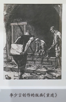 此次展览中,很多展品来自英雄家属甚至本人的捐赠。著名版画家李少言的作品《重建》就是其中之一。