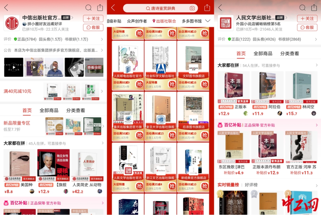 自今年4月首次推出“多多读书月”,8月底启动“多多读书月”第二季以来,商务印书馆、上海世纪出版集团、译林出版社等或开设官方旗舰店,或加深与平台合作。截至目前,商务印书馆官旗店的图书拼单量已超6万件,上海世纪出版官旗店的拼单量超7万件,两者也迅速积累了从近万到两万不等的店铺粉丝。