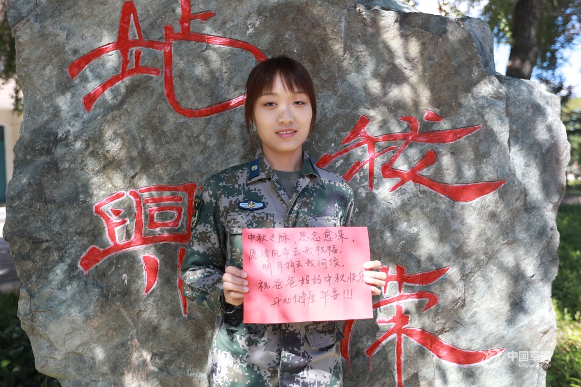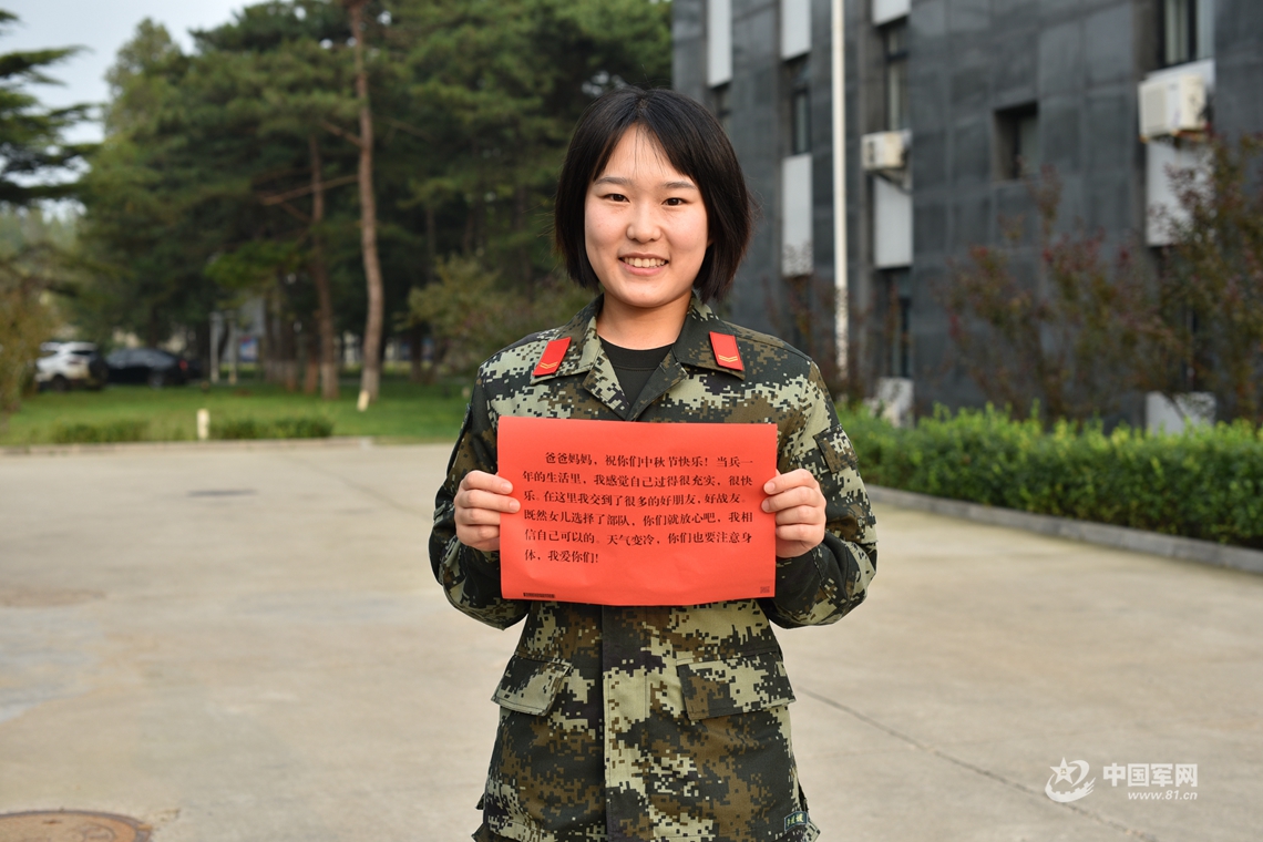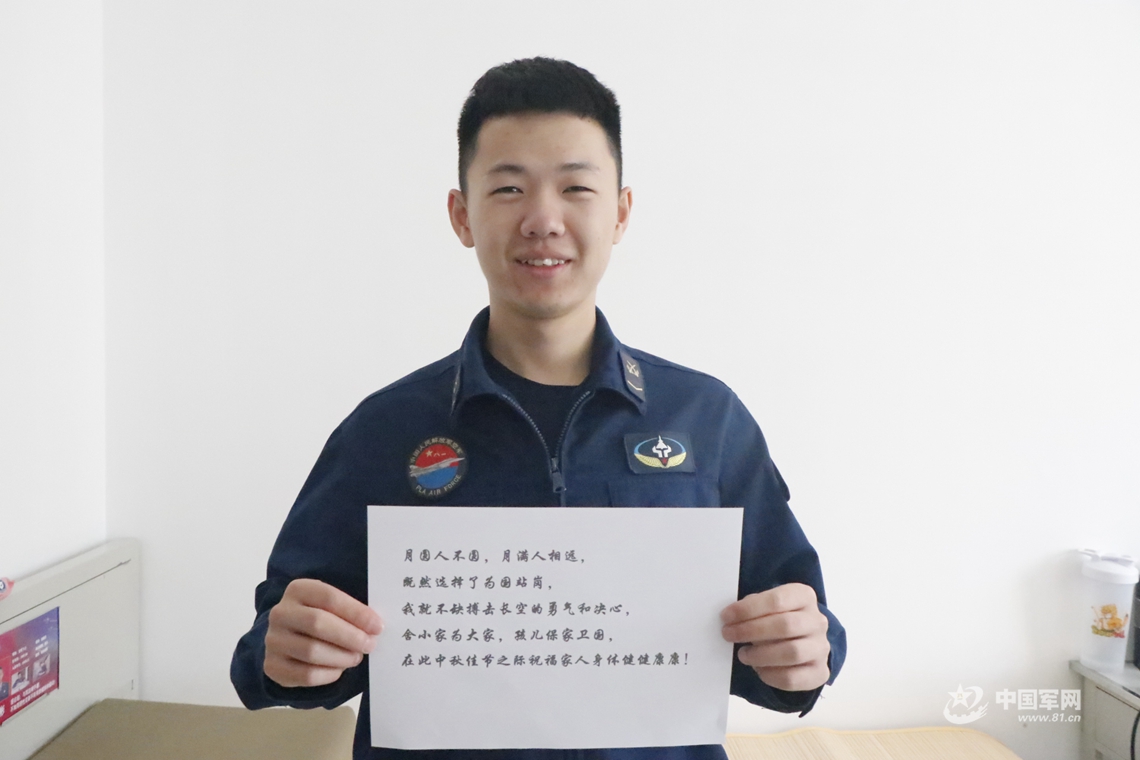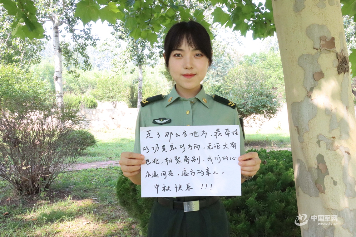 几年的军营磨练,让我从懵懂无知走向成熟稳重,我也愈发懂得你们的不易。每逢佳节,当我守护着万家灯火,最思念是家中的你们!爸爸妈妈,儿子在这里一切安好,希望家中的你们健健康康、开开心心!中秋节快乐!