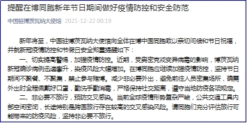据中国驻博茨瓦纳大使馆微信公众号消息,新年将至,中国驻博茨瓦纳大使馆向全体在博中国同胞致以亲切问候和节日祝福,并就新冠疫情防控和节假日安全郑重提醒如下: