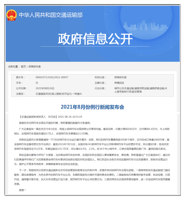 交通运输部新闻发言人孙文剑在回答中通报了7月份网约车行业运行的基本情况:目前,网约车覆盖我国300多个城市,日均完成订单量2000万单,据全国网约车监督信息交互平台统计,截至2021年7月31日,全国共有241家网约车平台公司取得网约车平台经营许可证,环比增加5家;各地共发放网约车驾驶员证351万本、车辆运输证135.7万本,环比增长0.5%、2.3%。在36个中心城市中,订单合规率最高的是广州,最低的是石家庄。