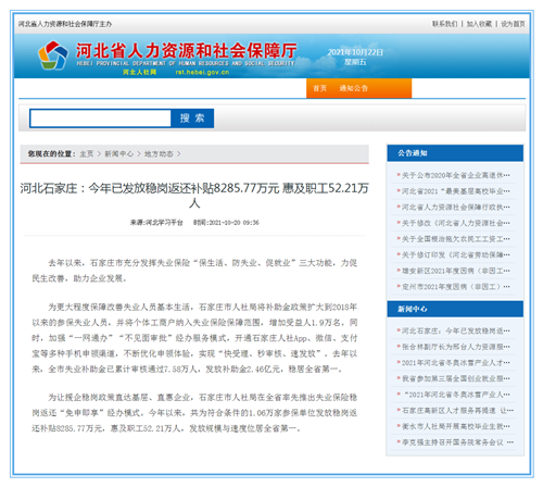 为让援企稳岗政策直达基层、直惠企业,石家庄市人社局在全省率先推出失业保险稳岗返还“免申即享”经办模式。今年以来,共为符合条件的1.06万家参保单位发放稳岗返还补贴8285.77万元,惠及职工52.21万人,发放规模与速度位居全省第一。