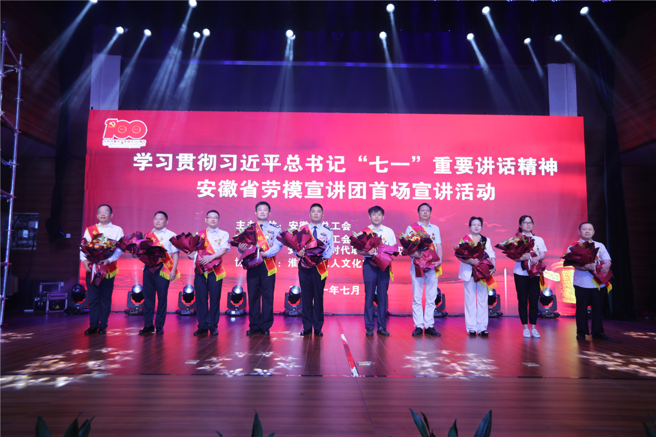 7月28日,安徽省总工会组织省劳模宣讲团在淮南市工人文化宫开展学习贯彻习近平总书记“七一”重要讲话精神首场宣讲活动。安徽省总工会党组书记、副主席徐发成出席活动并讲话。省总工会副主席胡东辉,淮南市人大常委会副主任、市总工会主席赵期中,淮南市人大常委会副主任沈斌,淮南市政协副主席李大松出席活动。