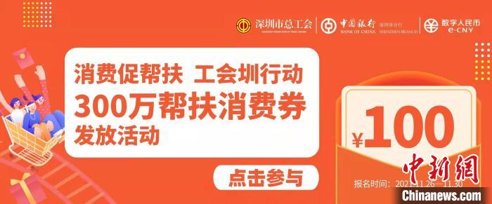 该消费券报名时间为11月26日至30日,深圳市总工会会员可通过“深圳工会”微信公众号进入“深工惠”服务平台报名参加,帮扶消费券将以数字人民币形式发放至中奖工会会员个人的“中国银行数字人民币钱包”中,并在“圳帮扶”APP上购买使用。