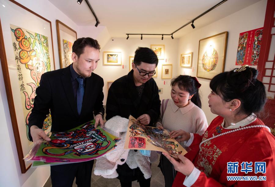 2月12日,在成都市人民公园,孙博秀芳(右一)在向购买成都年画的观众讲解作品寓意。 新华社记者 江宏景 摄