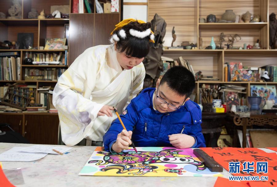 孙博秀芳在成都市青羊小区的工作室里指导学生画成都年画(2月2日摄)。 新华社记者 江宏景 摄