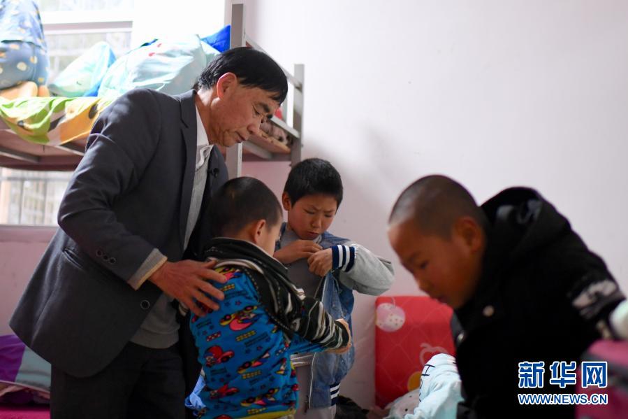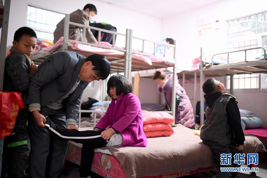3月1日清晨,庄桂淦帮着低年级的学生穿衣。新华社记者姜克红摄