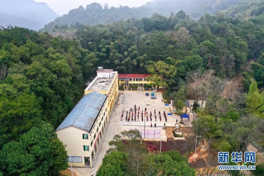 3月1日,西津畲族小学在升旗仪式后进行开学典礼(无人机照片)。新华社记者姜克红摄