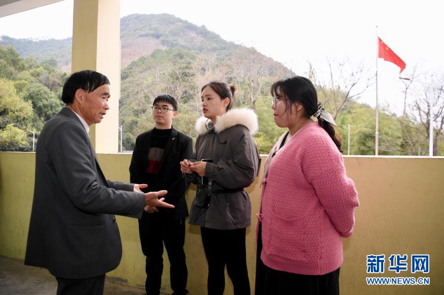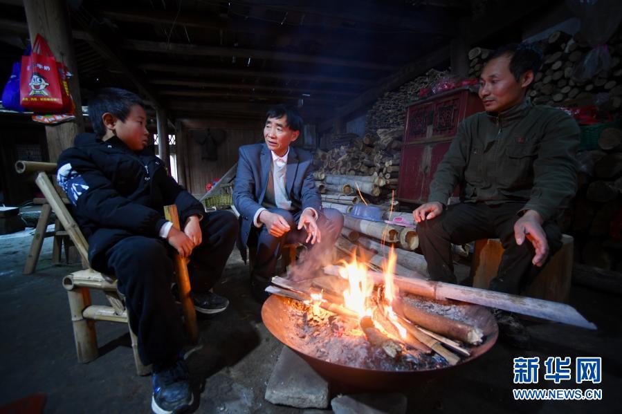 2月27日,庄桂淦(中)在开学前来到寄宿在舅舅家的留守儿童雷财康(左)家了解学生家庭情况。新华社记者姜克红摄