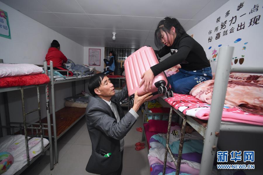 2月28日,庄桂淦帮助寄宿孩子搬运行李箱。新华社记者姜克红摄