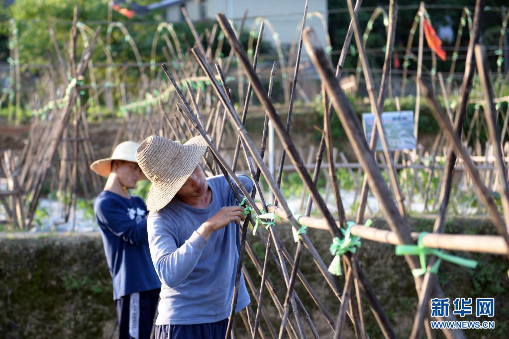 残障人士在长沙市上善助残服务中心的“同心农场”搭四季豆架(5月14日摄)。