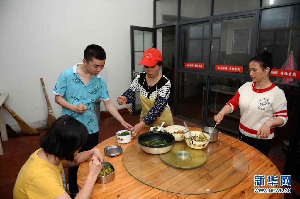 在长沙市上善助残服务中心,工作人员(右二)为残障人士打饭(5月14日摄)。