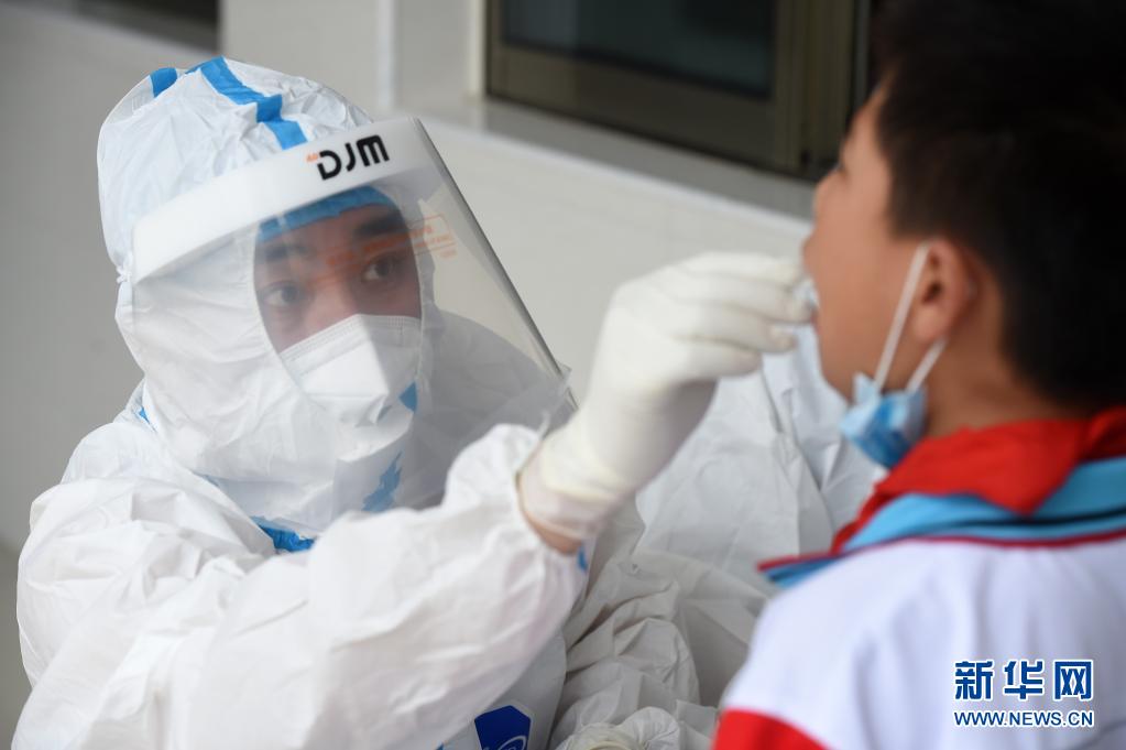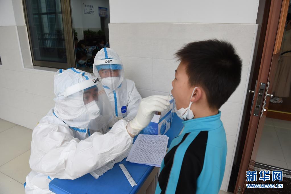 5月17日,在合肥大地学校,储开侠(右)协助核酸检测人员为学生进行核酸采样。“90后”储开侠是肥西县上派镇派河社区的一名工作人员,疫情出现后,储开侠顾不上照顾孩子,连续奋战在防疫一线,宣传防疫政策,组织居民开展核酸检测。